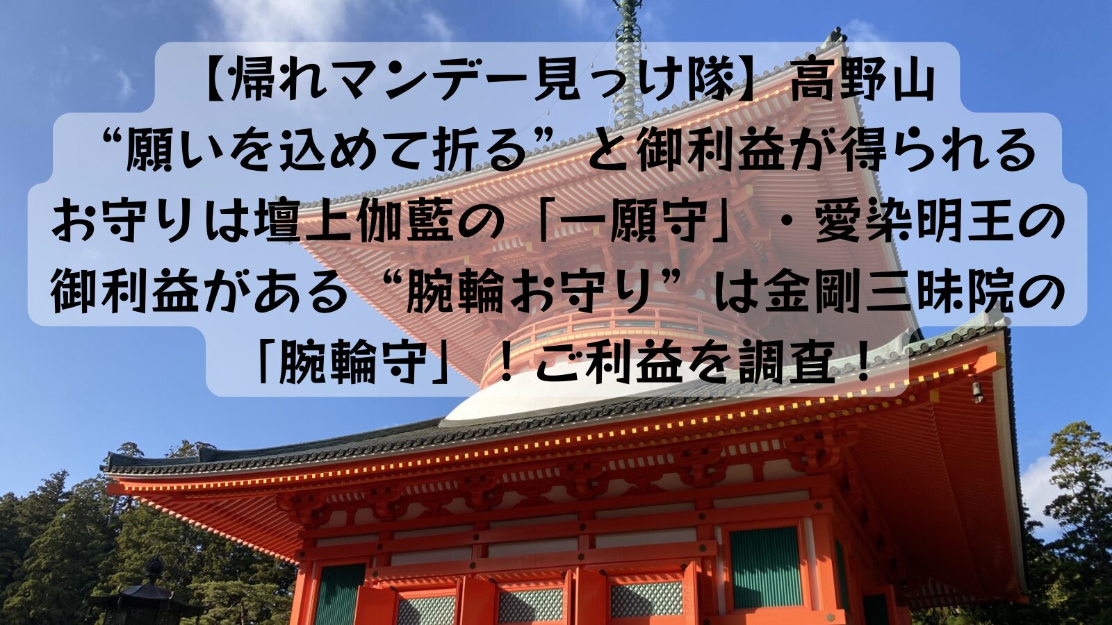帰れマンデー見っけ隊|高野山 “願いを込めて折る”と御利益が得られるお守りは壇上伽藍の「一願守」・愛染明王の御利益がある“腕輪お守り”は金剛三昧院の「腕輪守」!ご利益を調査!