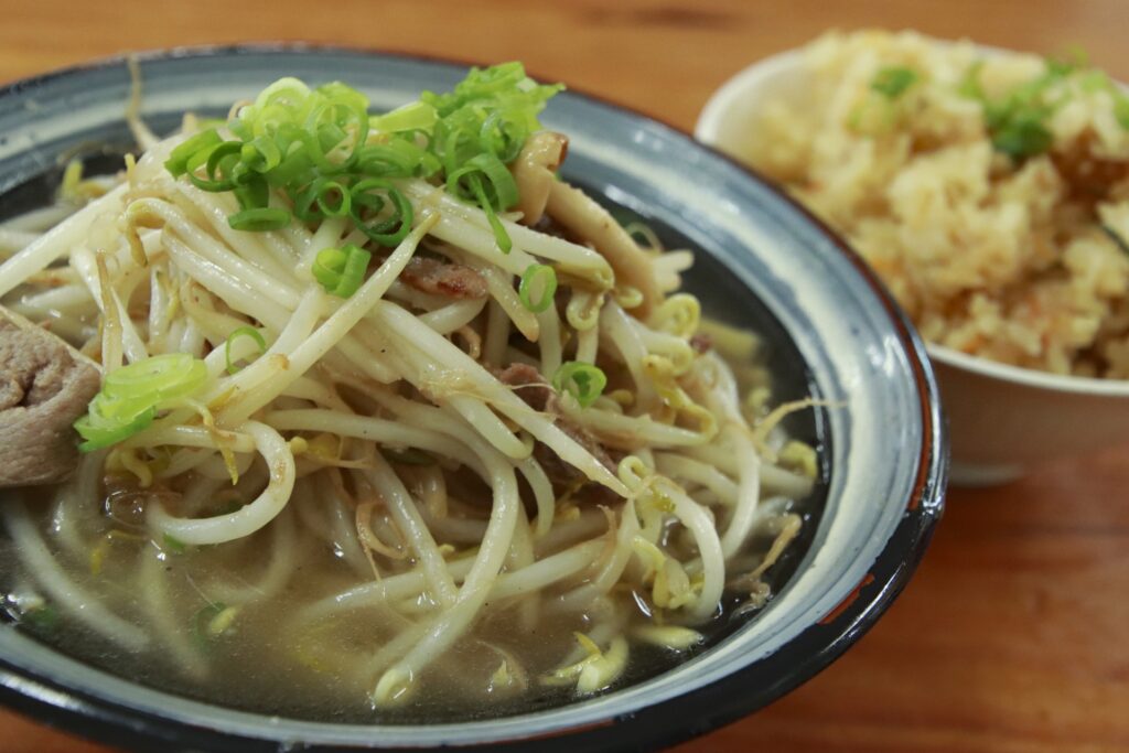 もやし麺もエビそばに負けないくらいの人気。投稿された写真を見ると、もやしがこれでもか!と入っていて、受け皿が2枚というボリューム感がありました。(1枚だとこぼれた汁を受け止めきれないのだと思います)