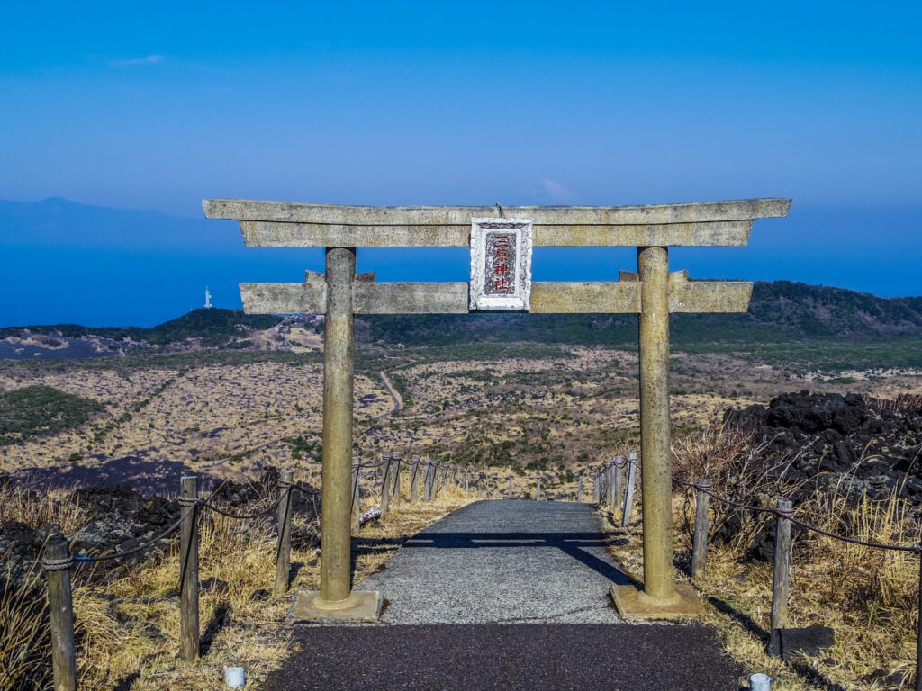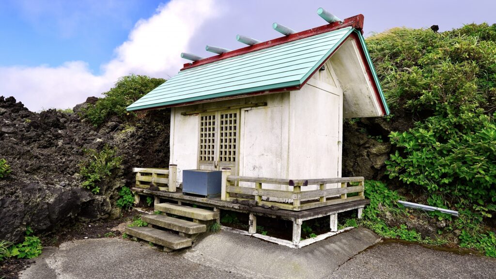 三原神社は活火山である三原山(標高758m)の山頂付近に位置し、古代から続く「御神火(ごじんか)信仰」の中心的な神社です。ちなみに三原山は海底部分まで含めると1000mほどの高さになるのだそう。