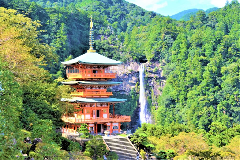 青岸渡寺は、世界遺産の熊野信仰の中心地で那智の滝と三重塔の絶景を堪能できる場所で、⽇本最古の巡礼路である西国三十三所観音霊場の第一番札所として知られています。
